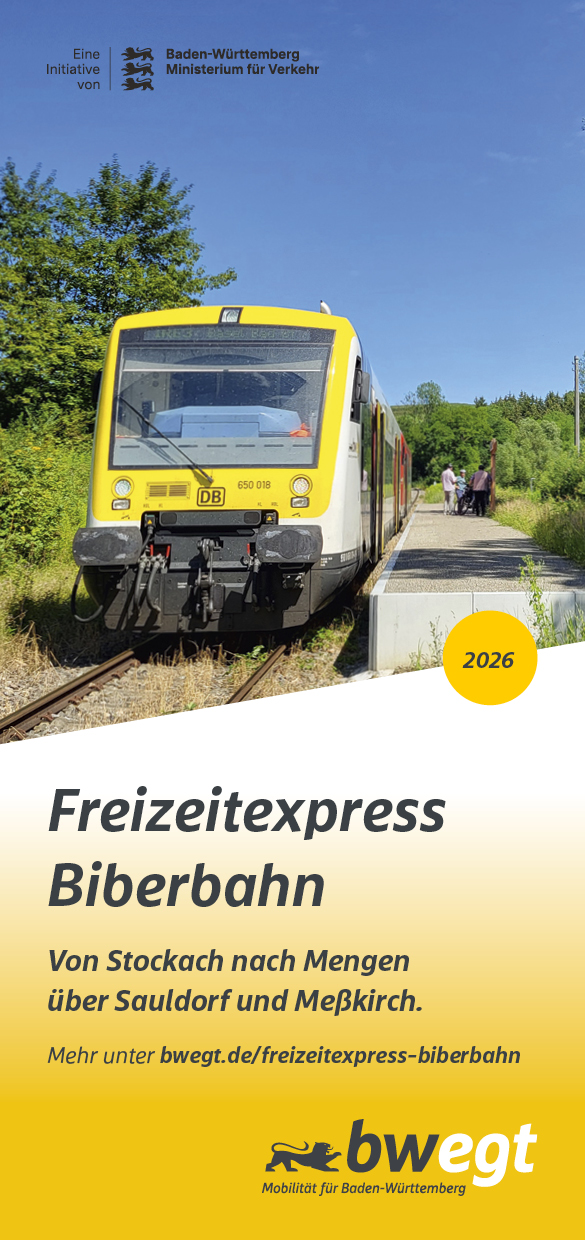 Der Freizeitexpress Biberbahn fährt von Mai bis Mitte Oktober mehrmals täglich zwischen Stockach, Meßkirch, Krauchenwies und Mengen. Im idyllischen Tal der Ablach ist der Biber ihr ständiger Begleiter. Entlang der Strecke gibt es viel zu entdecken: Museen in Meßkirch und Stockach sowie eine Zeitreise ins Mittelalter auf der Klosterbaustelle Campus Galli. Ein besonderer Tipp ist das Naturschutzgebiet Sauldorfer Seenplatte – ein Rückzugsort für Zugvögel und seltene Vogelarten.