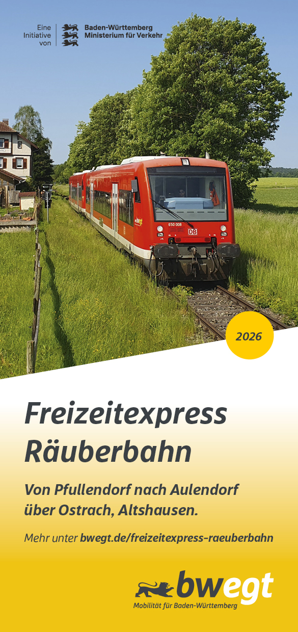 Die Räuberbahn verbindet Pfullendorf mit Aulendorf – Zwischenhalte in Burgweiler, Ostrach, Hoßkirch und Altshausen. Sie bietet einen bequemen Einstieg in die Region Oberschwaben. Das bereits in Baden gelegene Pfullendorf eignet sich ideal als Ausgangspunkt für Radtouren an den Bodensee, zur Donau oder durch die Landschaft des Linzgaus.