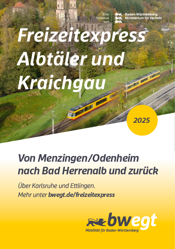 Der Freizeitexpress Albtäler/Kraichgau erschließt den Nordschwarzwald und den Kraichgau – ganz ohne Umstieg. Von Menzingen oder Odenheim geht es direkt ins Herz des Albtals bis nach Bad Herrenalb, auf einer Strecke, die nur selten befahren wird. In umgekehrter Richtung führen zwei abwechslungsreiche Routen in den Kraichgau: durch das Land der tausend Hügel nach Menzingen oder entlang des Katzbachtals nach Odenheim.