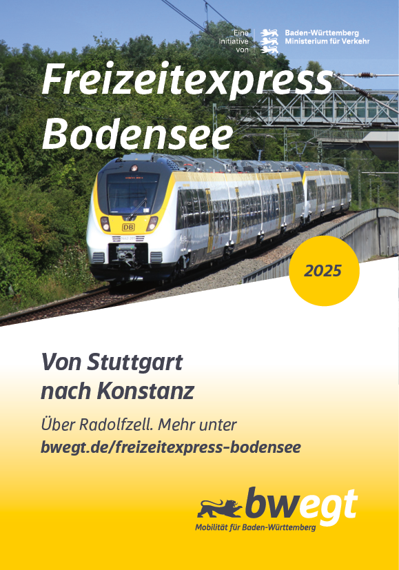 Der Freizeitexpress Bodensee verbindet Stuttgart über die Gäubahn mit dem Bodensee – einer der beliebtesten Ausflugsregionen des Landes. Entlang des Bodenseeradwegs gibt es zahlreiche Highlights zu entdecken, darunter die Klosterinsel Reichenau, die Insel Mainau, die Burg Meersburg oder das Naturschutzgebiet Wollmatinger Ried.