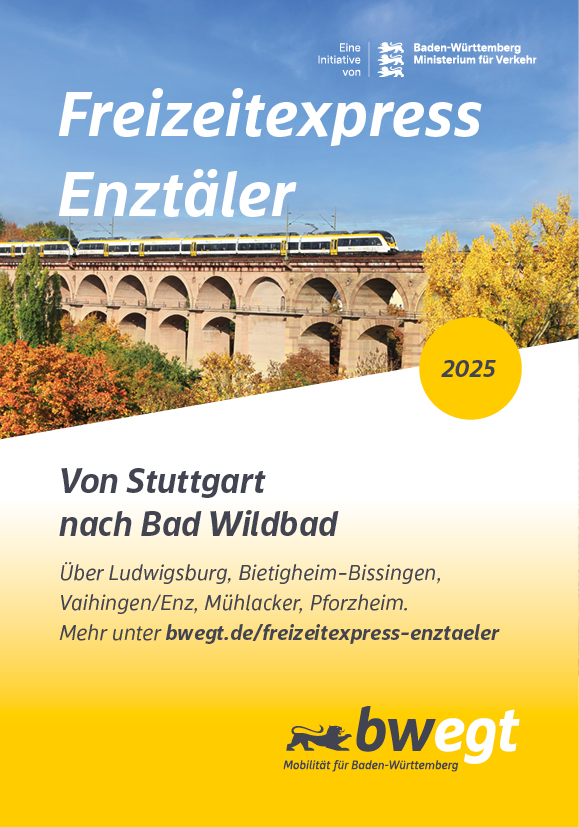 Von Mai bis Mitte Oktober bringt der Freizeitexpress Enztäler Fahrgäste an Sonn- und Feiertagen zuverlässig von Stuttgart ins Enztal nach Bad Wildbad. Entlang der Strecke warten besondere Ausflugsziele wie der Baumwipfelpfad und die Hängebrücke Wildline auf dem Sommerberg in Bad Wildbad sowie das Schmuckmuseum und das 360-Grad-Panorama im Gasometer in Pforzheim.