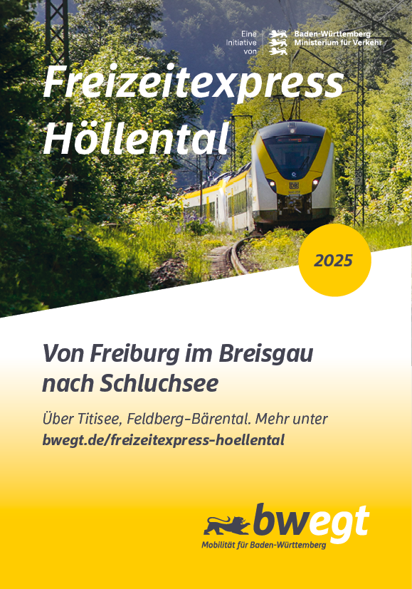 Der Freizeitexpress Höllental verbindet Freiburg mit dem Hochschwarzwald - über Titisee bis zum Schluchsee und weiter in Richtung Feldberg. An Wochenenden und Feiertagen ergänzt die Verbindung ganzjährig am Morgen und Nachmittag das bestehende S-Bahn-Angebot und bringt Ausflügler:innen mit wenigen Zwischenhalten in eine der beliebtesten Ausflugsregionen von Baden-Württemberg. Der neue Flyer informiert über Touren und Freizeitangebote entlang der Strecke.