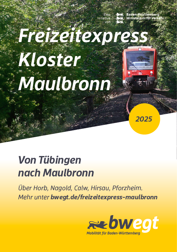 Der Freizeitexpress Kloster Maulbronn fährt an Sonn- und Feiertagen von Tübingen über Calw nach Maulbronn – auf den Spuren von Hermann Hesse. Die Strecke verbindet zentrale Lebensorte des Dichters. Unterwegs lohnen sich Abstecher zum Kloster St. Peter und Paul in Hirsau und in das Schwarzwaldstädtchen Calw, den Geburtsort von Hermann Hesse.