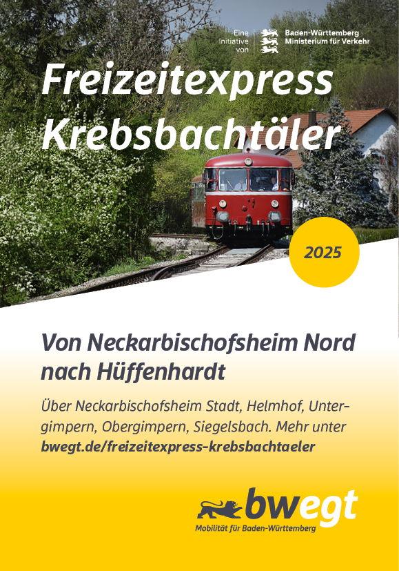 Freizeitexpress Krebsbachtäler - Auflage vergriffen Neckarbischofsheim - Hüffenhardt Der Freizeitexpress Krebsbachtäler fährt auf der 17 Kilometer langen Bahnstrecke zwischen Neckarbischofsheim Nord und Hüffenhardt. Er verbindet den Kraichgau mit dem Kleinen Odenwald – bequem und ohne Umstieg. Entlang der Strecke laden das Landschaftsschutzgebiet Krebsbachtal und die Burg Guttenberg mit ihrer Greifvogelwarte zu einem Ausflug ein.