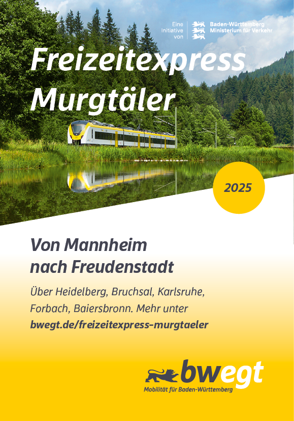 Die Direktverbindung aus der Rhein-Neckar-Region in den Schwarzwald. Der Freizeitexpress fährt ganzjährig an Sonn- und Feiertagen von Mannheim über Heidelberg, Bruchsal, Karlsruhe und Rastatt bis nach Freudenstadt. Die Mehrzweckabteile bieten Platz für Fahrräder – ideal für alle, die ihre Radtour auf der Tour de Murg in Gaggenau, Gernsbach, Forbach oder Baiersbronn beginnen möchten. 2025: Gartenschau Tal X in Baiersbronn und Freudenstadt. |