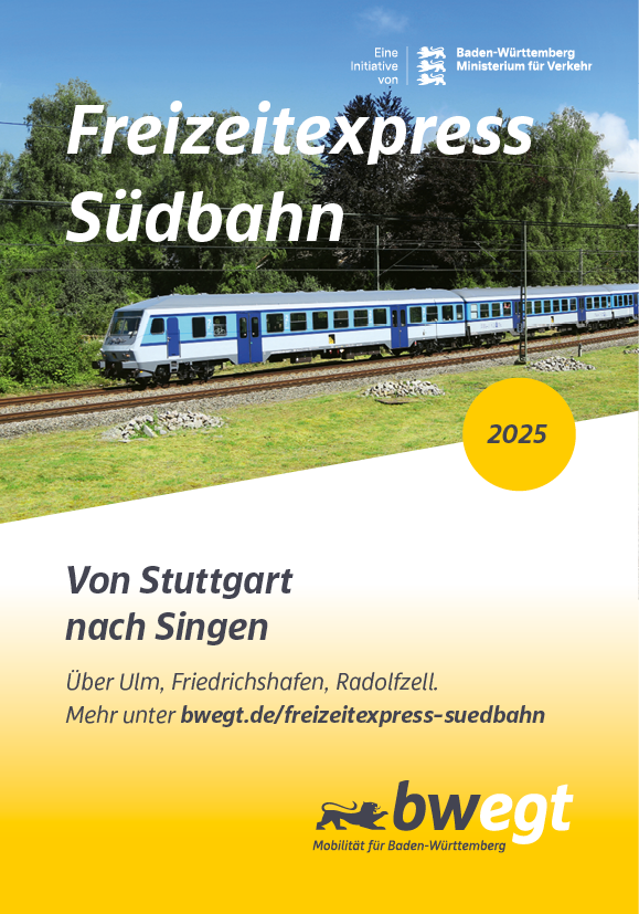 Der Freizeitexpress Südbahn bietet eine direkte und komfortable Verbindung von Stuttgart über Ulm bis an den westlichen Bodensee und in den Hegau. Unterwegs hält der Zug an attraktiven Stationen wie Bodman-Ludwigshafen, Sipplingen oder der Bodensee-Therme Überlingen.