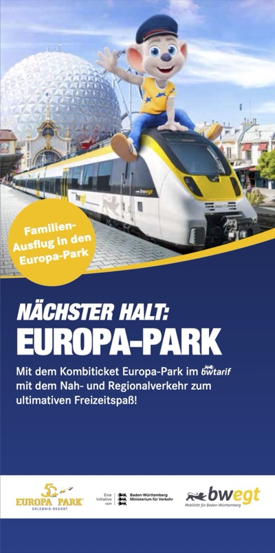 Der Flyer zeigt, wie einfach und umweltfreundlich die Anreise in den Europa-Park mit Nah- und Regionalverkehr ist. Er informiert über Preise, Geltungsbereiche und das praktische Kombiticket Europa-Park im bwtarif – ideal für Freizeitreisende und Familien. Perfekt für alle, die stressfrei und nachhaltig zum ultimativen Freizeitspaß reisen möchten!
