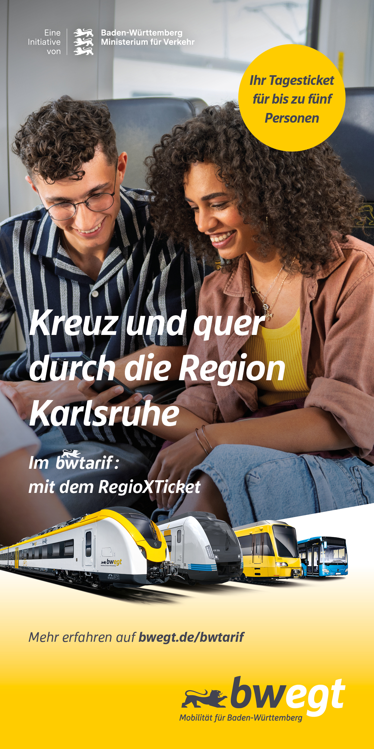 Der Flyer informiert über das RegioXTicket, das flexible Tagestouren in der Region Karlsruhe ermöglicht. Das Ticket gilt für bis zu fünf Personen und deckt vier Verkehrsverbünde ab. Enthalten sind Nah- und Regionalverkehrszüge, S-Bahnen, Stadtbahnen und Busse. Der Flyer bietet eine Übersicht zu Preisen, Geltungsbereichen und Kaufmöglichkeiten. Ideal für flexible Entdeckungsreisen in der Region Karlsruhe und Umgebung.
